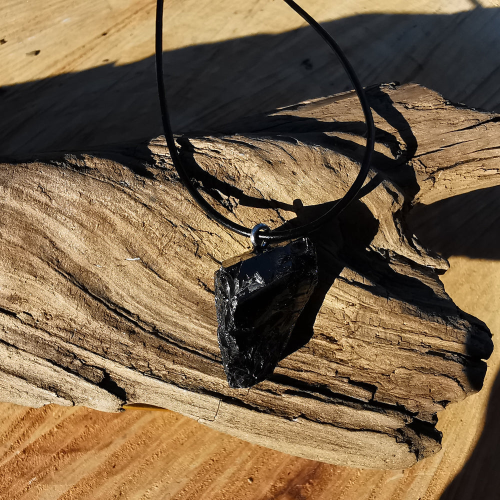 Anhänger mit Edelschungit roh und glänzend. Inklusive schwarzem Lederband aus Ziegenleder. Mit allen Vorzügen und der einmaligen Schutzwirkung von Edelschungit.