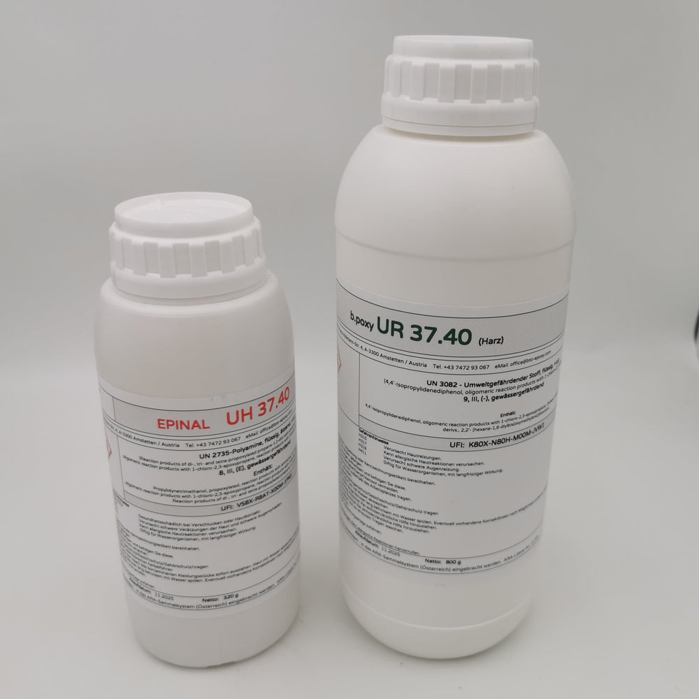 b.poxy UR 37.40 / Epinal UH 37.40 ist ein UV-geschütztes sehr gut lichtbeständiges, transparentes Epoxyharzsystem für viele Gießanwendungen. Durch die reduzierte Reaktionsfreudigkeit des Systems können Schichtstärken bis zu 50 mm in einem Arbeitsgang gegossen werden (Material- & Raumtemperatur max. 23°C). Selbst bei einer Härtungstemperatur von 40°C sind Schichtstärken von 20 mm problemlosherzustellen. Es besitzt ausgezeichnete Haftungseigenschaften auf diversen Geweben, Schaumstoffen, Holz und mineralischen Werkstoffen. Mineralische Füllstoffe sowie auch Leichtfüllstoffe können bei Bedarf problemlos beigemengt werden. Je nach Füllstoffart kann sich dadurch die Topfzeit, Verarbeitungszeit und auch die Härtungszeit verlängern bzw. verkürzen.