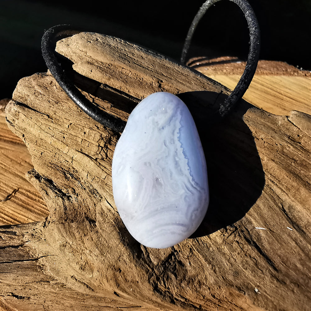 Blauer Chalcedon (Blue Lace) Trommelstein in Extraqualität, gebohrt.
