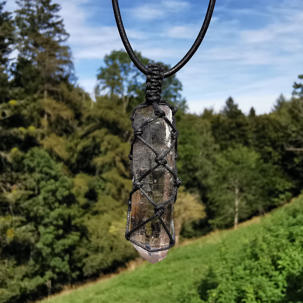 Helle schweizer Rauchquarzspitze aus dem Oberwallis. Eingeflochten in Baumwolle gewachst schwarz.