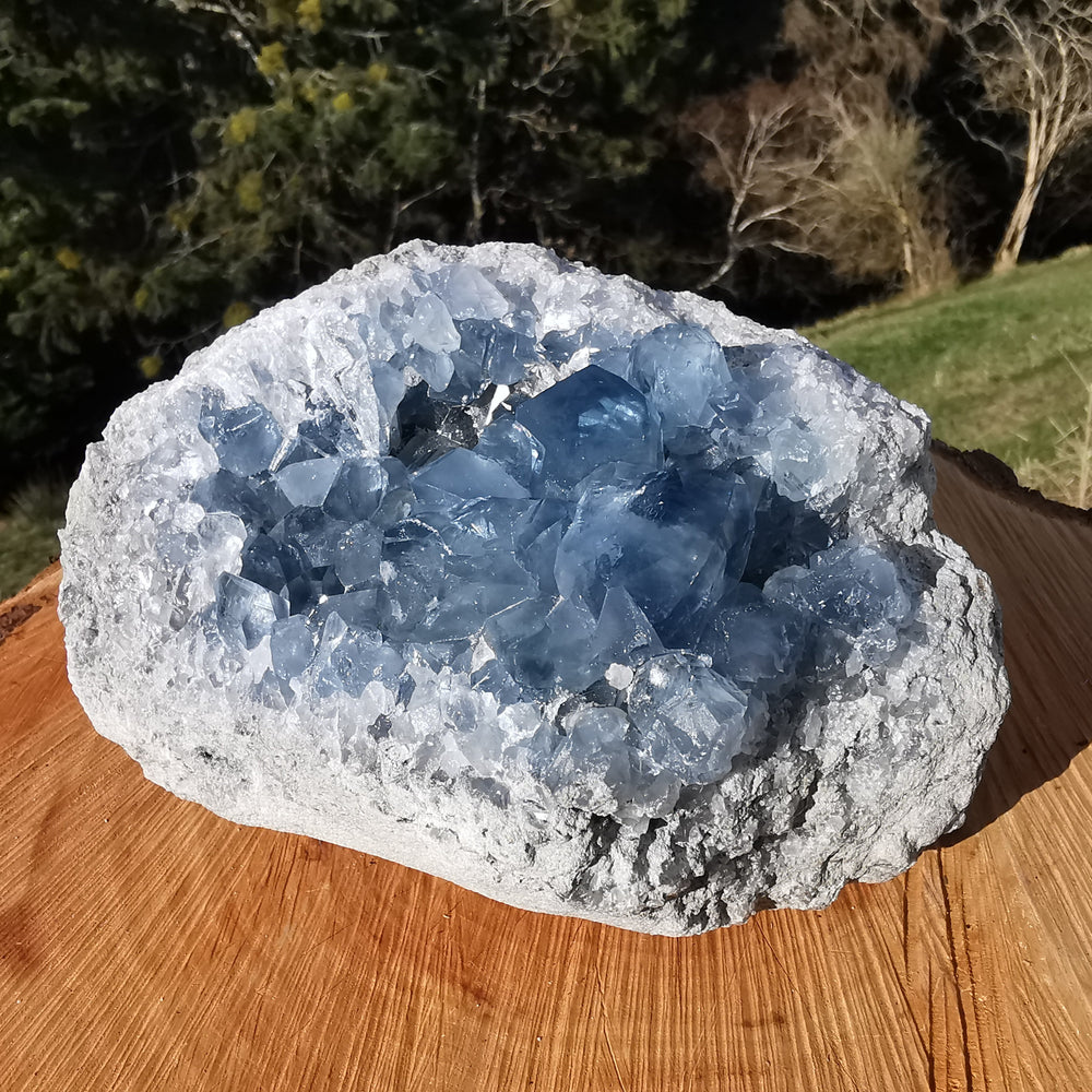 Der Name Coelestin bedeutet dem Himmel zugewandt. Besonders zu erwähnen sind seine abschirmenden und reinigenden Eigenschaften auf die Chakren und die Aura welche durch ihn ausgeglichen, klar und rein werden. Der Coelestin kann als Hoffnungsstrahl in düsteren Tagen wirken weil er Ruhe und Harmonie ins Leben bringt. Er vermag Schmerz und Chaos in Licht und Liebe zu verwandeln und eignet sich ausgezeichnet für Astralreisen und die Traumerinnerungsarbeit weshalb ein Coelestin im Schlafzimmer oder zur Meditation nicht fehlen sollte.