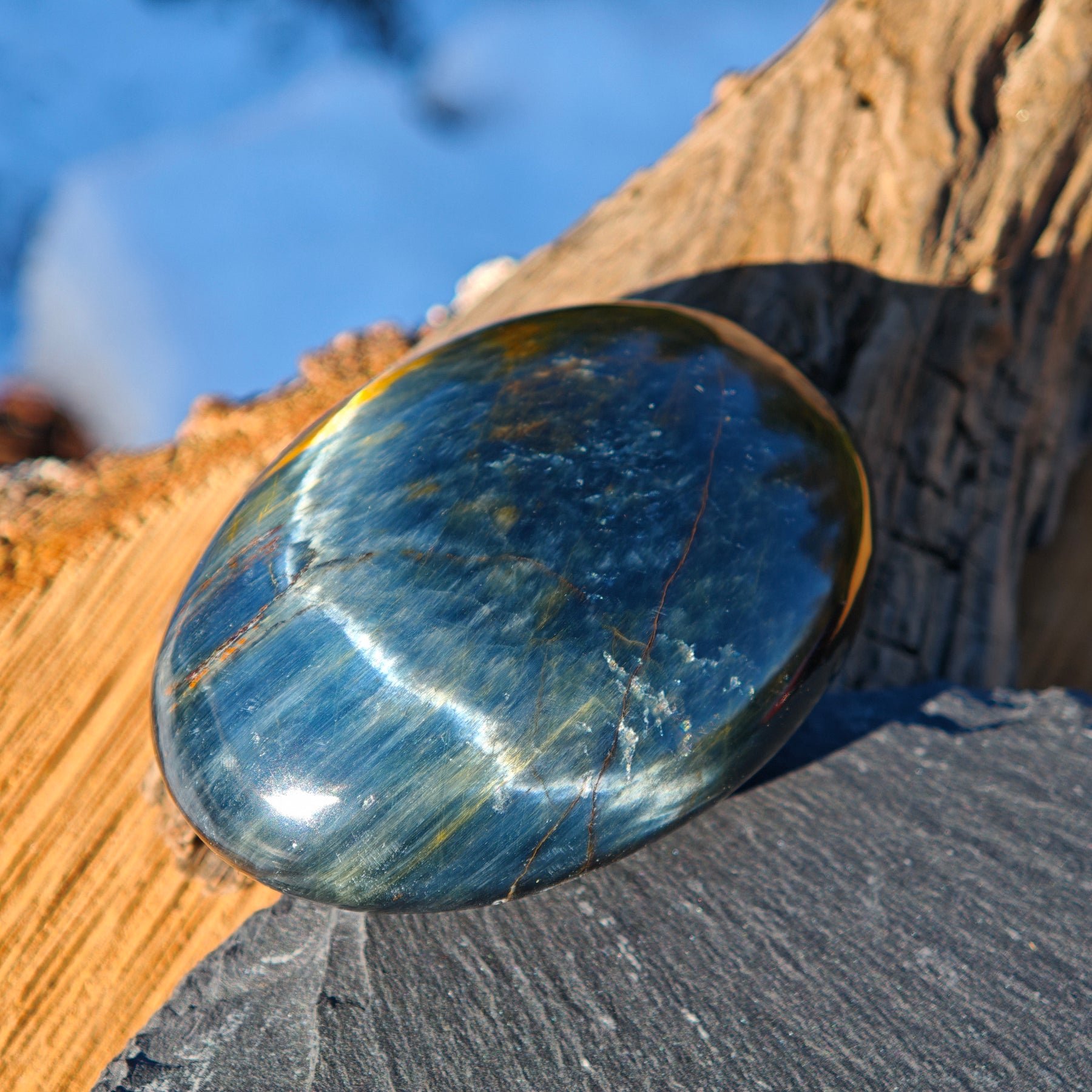 Das Falkenauge, auch bekannt als blaues Tigerauge steht für Mut, Klarheit, Schutz und Weitblick. Sie zeigen eine faszinierende blaue Lichtreflexion der Faserstruktur.