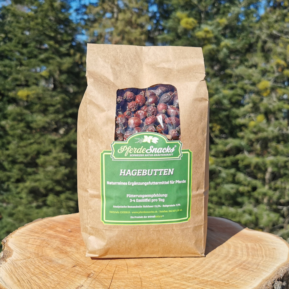 Hagebutte verfügt über Vitamin C in hoher Dosis. Sie ist ein sehr guter Entzündungshemmer. Hagebuttenpulver ist also bestens geeignet zur Stärkung des Immunsystems und für Pferde mit Problemen am Bewegungsapparat.