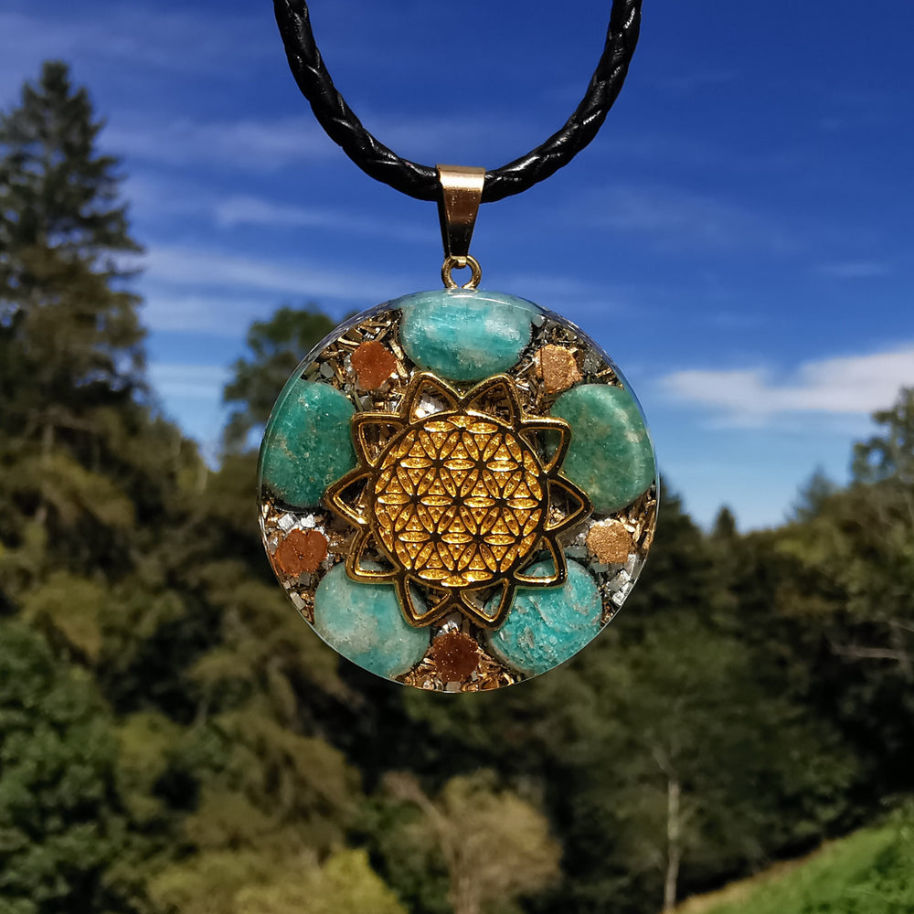Orgone Anhänger gross INNERE RUHE mit AMAZONIT Lebensblume gold
