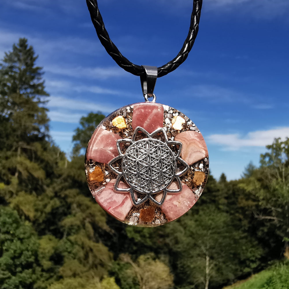 Orgone Anhänger gross LIEBE mit RHODOCHROSIT Lebensblume silber