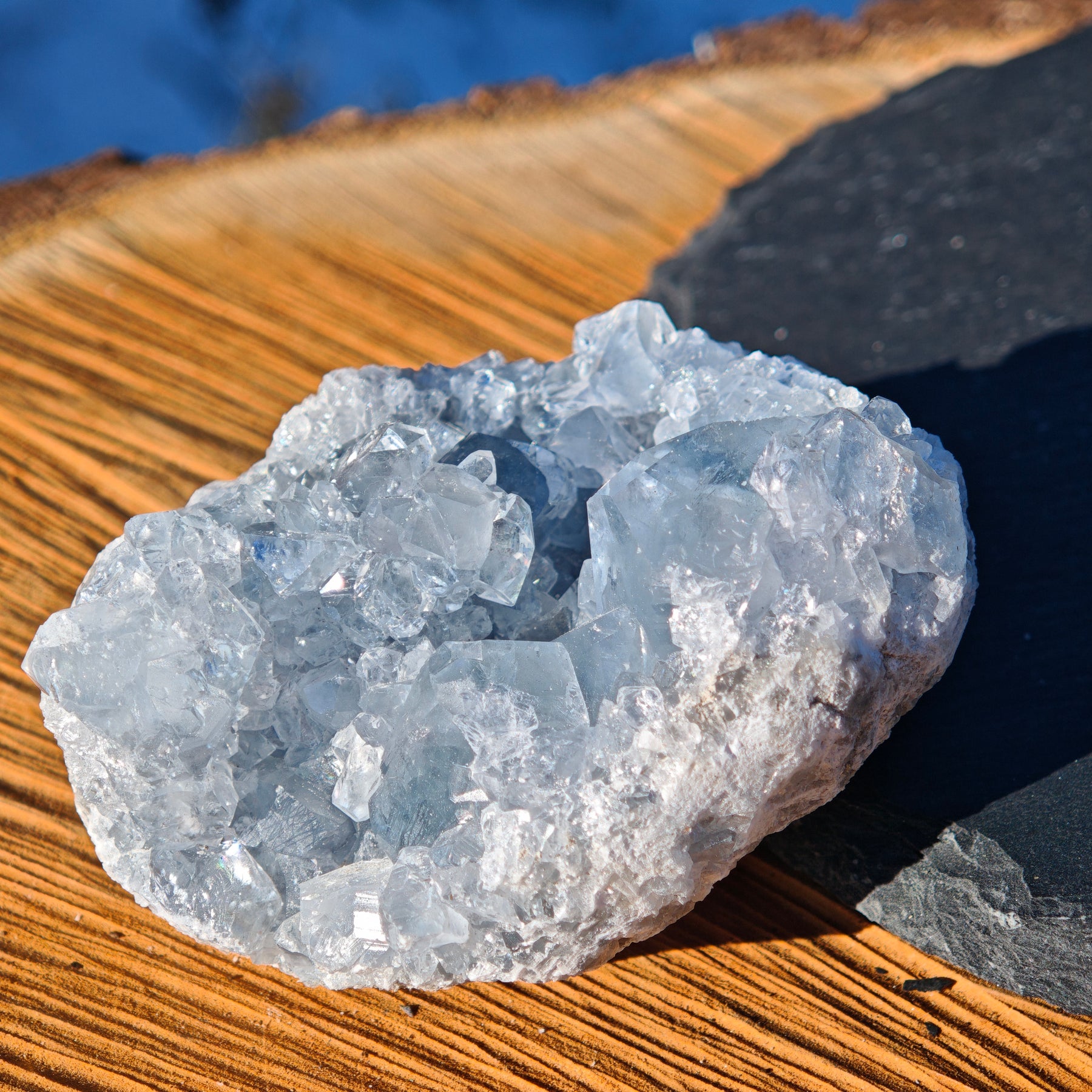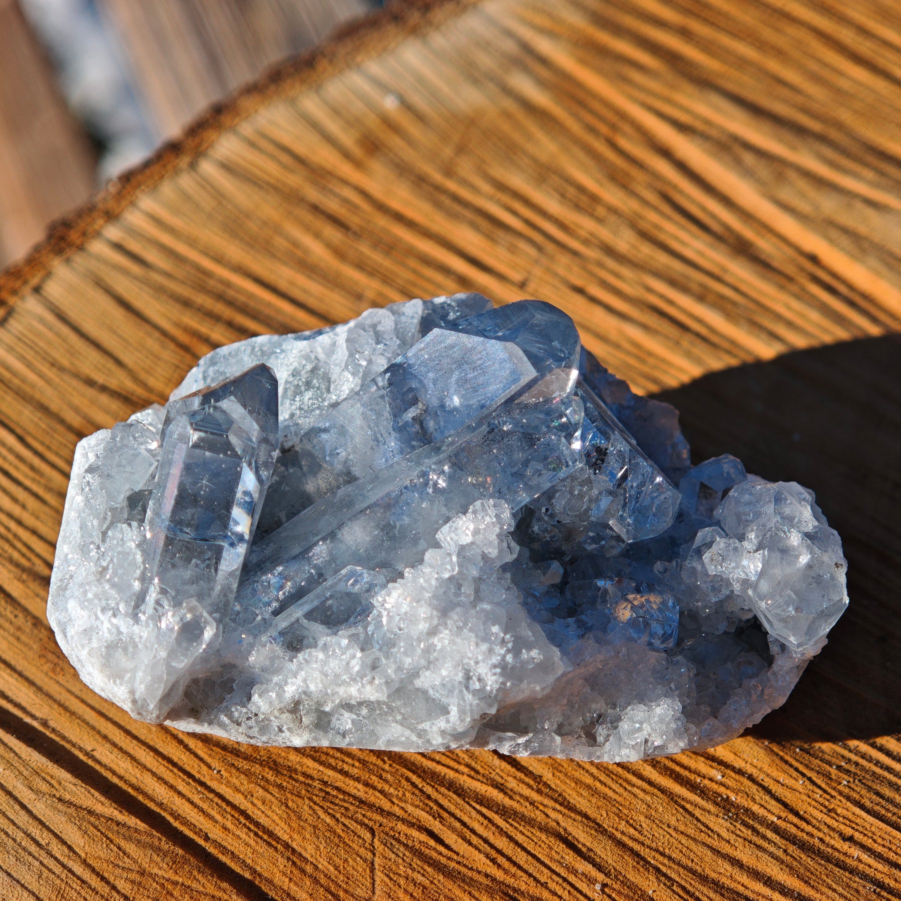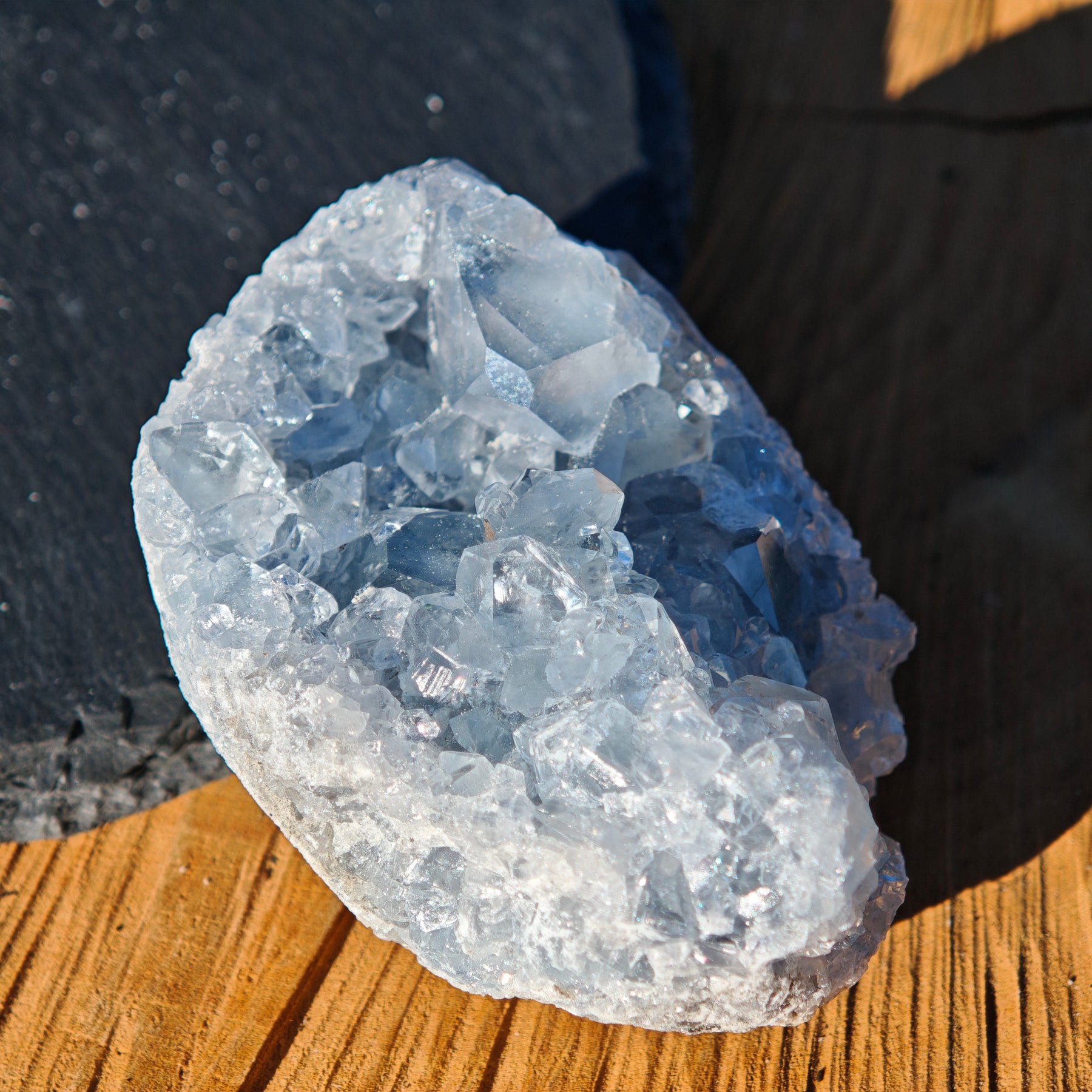 Der blaue Coelestin eignet sich für alle geistigen Aktivitäten, insbesondere um reale Probleme zu analysieren. Besonders hilft er dabei ein Problem, eine Situation oder eine Vorstellung in seiner ganzen Weite zu überblicken. Besonders zu erwähnen sind seine abschirmenden und reinigenden Eigenschaften auf die Chakren und die Aura welche durch ihn ausgeglichen, klar und rein werden. Der Coelestin kann als Hoffnungsstrahl in düsteren Tagen wirken weil er Ruhe und Harmonie ins Leben bringt. Er vermag Schmerz und Chaos in Licht und Liebe zu verwandeln. Wir können aufhören, uns Sorgen zu machen, können uns frei bewegen und immaterielle Werte mit einem klaren und zufriedenen Geist verfolgen. Coelestin verfügt über eine innere Weisheit und hat seinem Benutzer etwas zu erzählen. Das Wissen des Steins hilft meist in spirituellen Bereichen und dient unserer Vervollkommnung. Er eignet sich ausgezeichnet für Astralreisen und die Traumerinnerungsarbeit weshalb ich einen Coelestin im Schlafzimmer oder zur Meditation nur empfehlen kann.