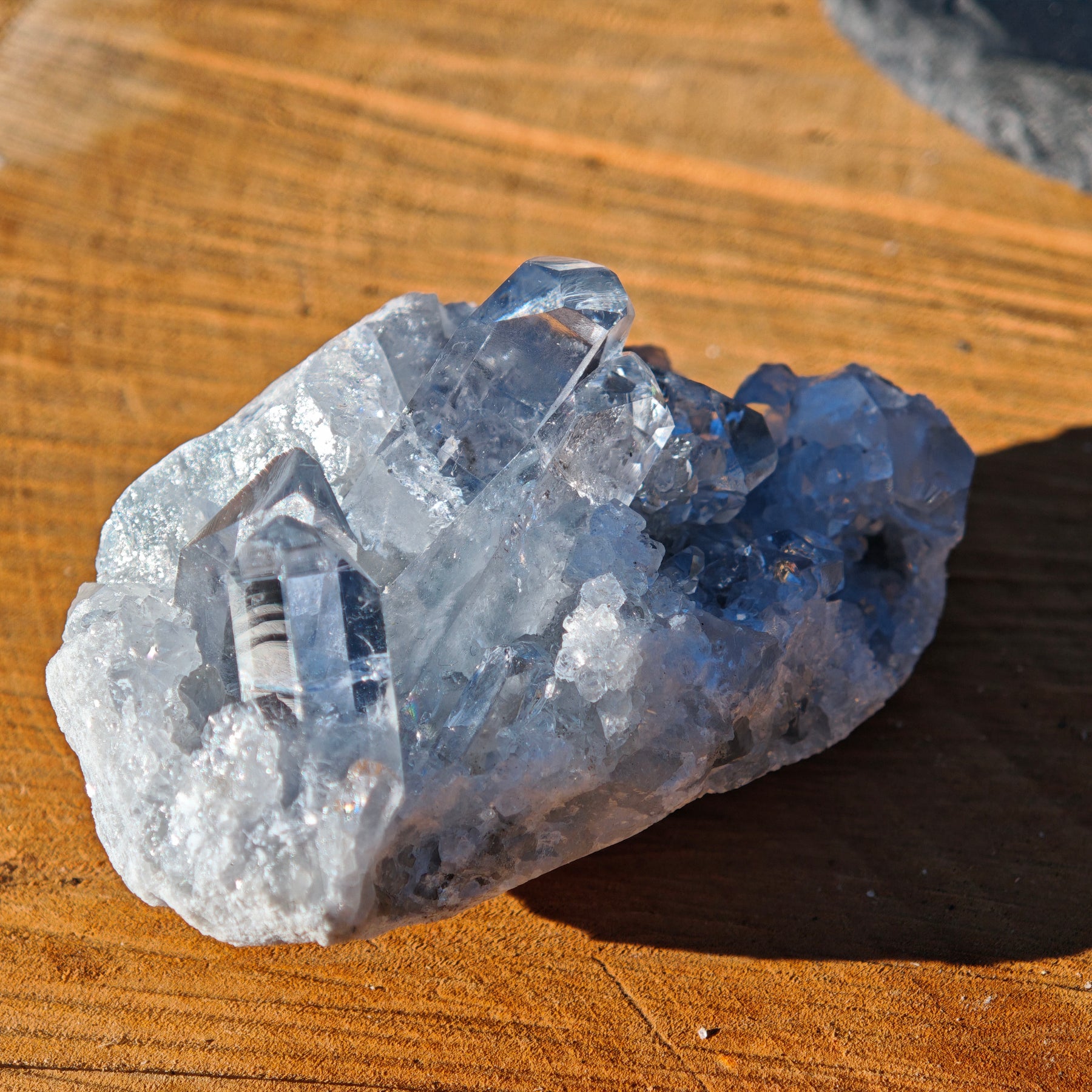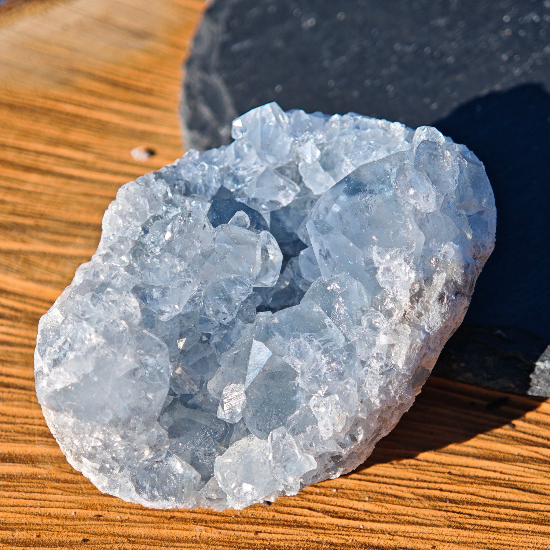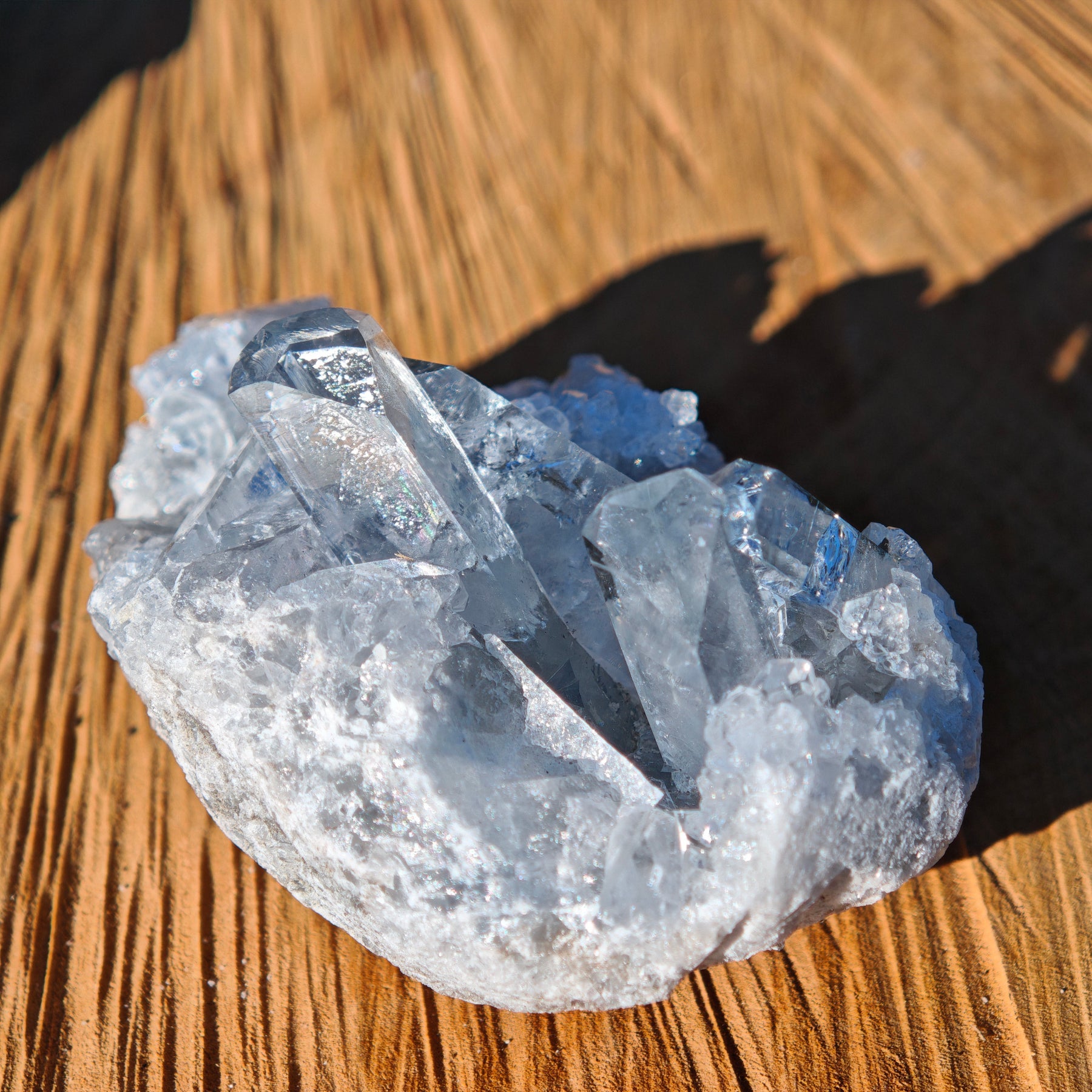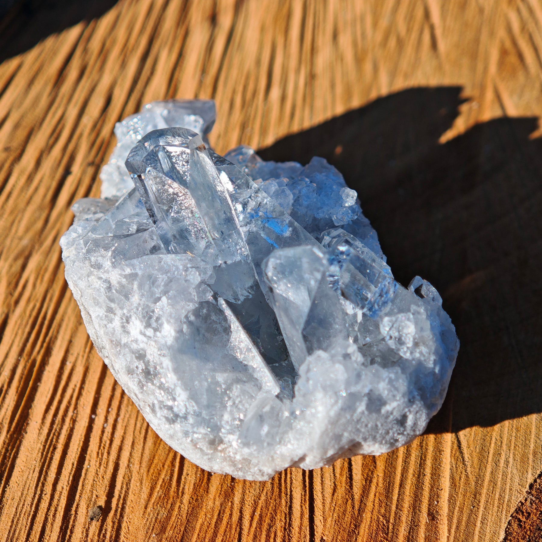 Der blaue Coelestin eignet sich für alle geistigen Aktivitäten, insbesondere um reale Probleme zu analysieren. Besonders hilft er dabei ein Problem, eine Situation oder eine Vorstellung in seiner ganzen Weite zu überblicken. Besonders zu erwähnen sind seine abschirmenden und reinigenden Eigenschaften auf die Chakren und die Aura welche durch ihn ausgeglichen, klar und rein werden. Der Coelestin kann als Hoffnungsstrahl in düsteren Tagen wirken weil er Ruhe und Harmonie ins Leben bringt. Er vermag Schmerz und Chaos in Licht und Liebe zu verwandeln. Wir können aufhören, uns Sorgen zu machen, können uns frei bewegen und immaterielle Werte mit einem klaren und zufriedenen Geist verfolgen. Coelestin verfügt über eine innere Weisheit und hat seinem Benutzer etwas zu erzählen. Das Wissen des Steins hilft meist in spirituellen Bereichen und dient unserer Vervollkommnung. Er eignet sich ausgezeichnet für Astralreisen und die Traumerinnerungsarbeit weshalb ich einen Coelestin im Schlafzimmer oder zur Meditation nur empfehlen kann.
